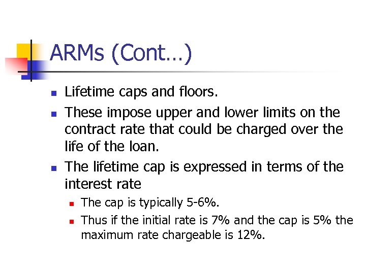 ARMs (Cont…) n n n Lifetime caps and floors. These impose upper and lower limits on the contract rate that could be charged over the life of the loan. The lifetime cap is expressed in terms of the interest rate n n The cap is typically 5 -6%. Thus if the initial rate is 7% and the cap is 5% the maximum rate chargeable is 12%.