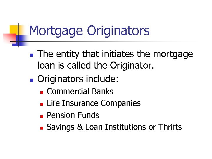 Mortgage Originators n n The entity that initiates the mortgage loan is called the Originators include: n n Commercial Banks Life Insurance Companies Pension Funds Savings & Loan Institutions or Thrifts