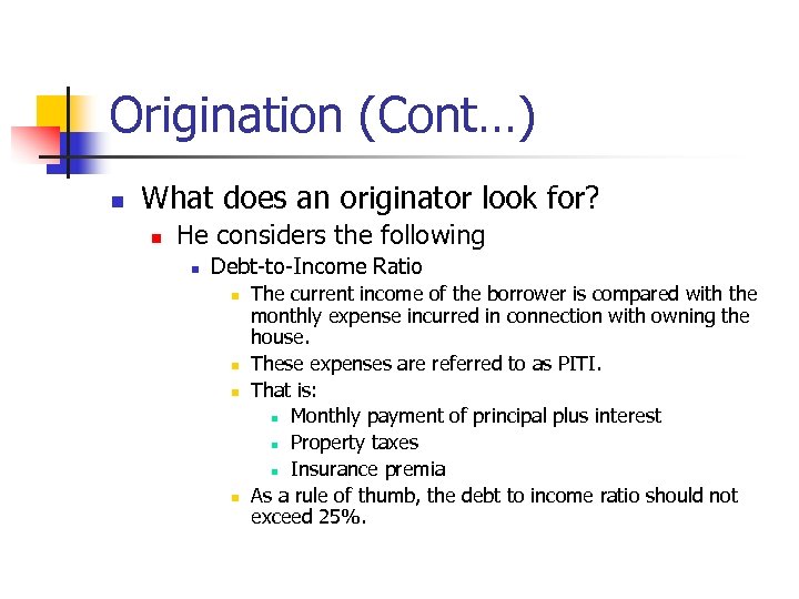 Origination (Cont…) n What does an originator look for? n He considers the following n Debt-to-Income Ratio n n The current income of the borrower is compared with the monthly expense incurred in connection with owning the house. These expenses are referred to as PITI. That is: n Monthly payment of principal plus interest n Property taxes n Insurance premia As a rule of thumb, the debt to income ratio should not exceed 25%.