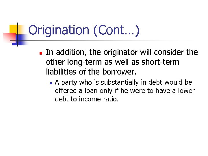 Origination (Cont…) n In addition, the originator will consider the other long-term as well as short-term liabilities of the borrower. n A party who is substantially in debt would be offered a loan only if he were to have a lower debt to income ratio.