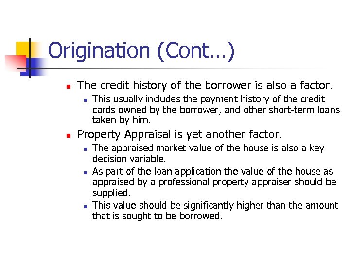 Origination (Cont…) n The credit history of the borrower is also a factor. n n This usually includes the payment history of the credit cards owned by the borrower, and other short-term loans taken by him. Property Appraisal is yet another factor. n n n The appraised market value of the house is also a key decision variable. As part of the loan application the value of the house as appraised by a professional property appraiser should be supplied. This value should be significantly higher than the amount that is sought to be borrowed.