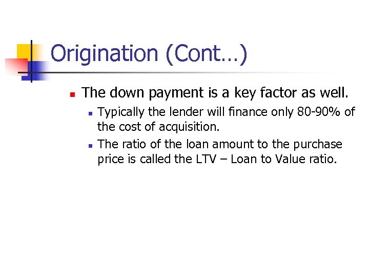 Origination (Cont…) n The down payment is a key factor as well. n n Typically the lender will finance only 80 -90% of the cost of acquisition. The ratio of the loan amount to the purchase price is called the LTV – Loan to Value ratio.