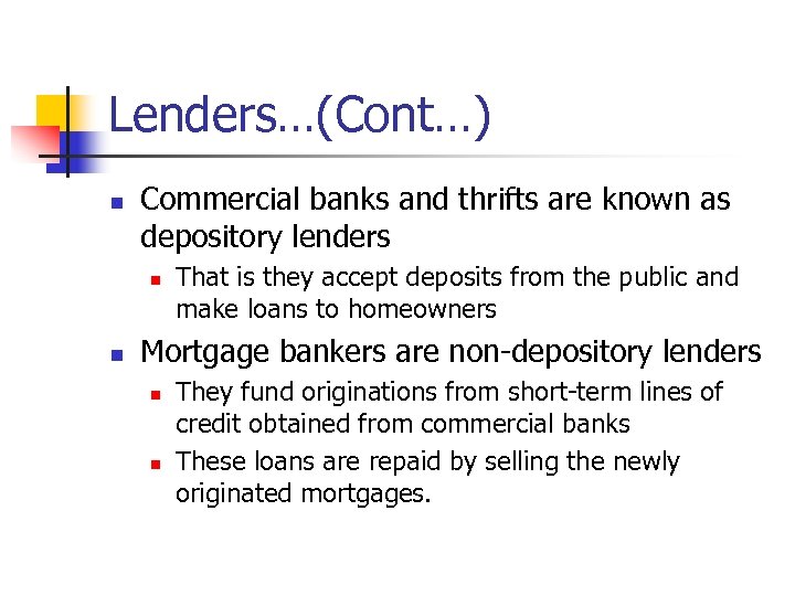 Lenders…(Cont…) n Commercial banks and thrifts are known as depository lenders n n That is they accept deposits from the public and make loans to homeowners Mortgage bankers are non-depository lenders n n They fund originations from short-term lines of credit obtained from commercial banks These loans are repaid by selling the newly originated mortgages.