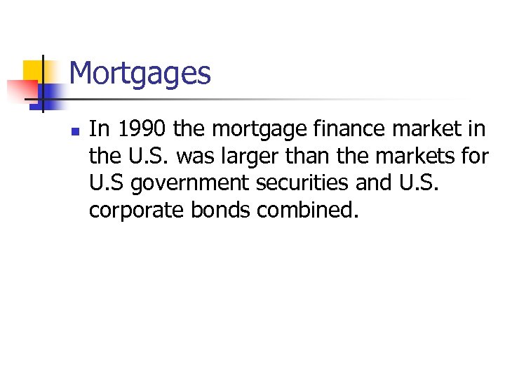 Mortgages n In 1990 the mortgage finance market in the U. S. was larger than the markets for U. S government securities and U. S. corporate bonds combined.