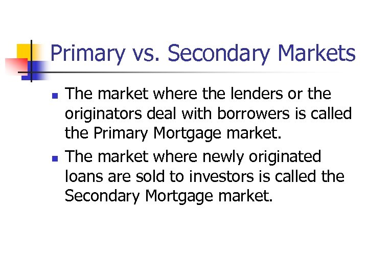 Primary vs. Secondary Markets n n The market where the lenders or the originators deal with borrowers is called the Primary Mortgage market. The market where newly originated loans are sold to investors is called the Secondary Mortgage market.