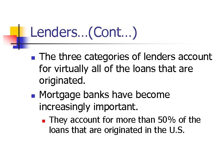 Lenders…(Cont…) n n The three categories of lenders account for virtually all of the loans that are originated. Mortgage banks have become increasingly important. n They account for more than 50% of the loans that are originated in the U. S.