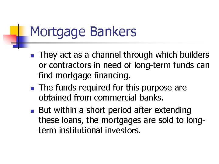 Mortgage Bankers n n n They act as a channel through which builders or contractors in need of long-term funds can find mortgage financing. The funds required for this purpose are obtained from commercial banks. But within a short period after extending these loans, the mortgages are sold to longterm institutional investors.