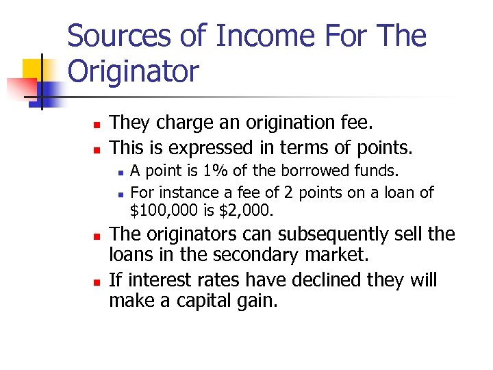 Sources of Income For The Originator n n They charge an origination fee. This is expressed in terms of points. n n A point is 1% of the borrowed funds. For instance a fee of 2 points on a loan of $100, 000 is $2, 000. The originators can subsequently sell the loans in the secondary market. If interest rates have declined they will make a capital gain.