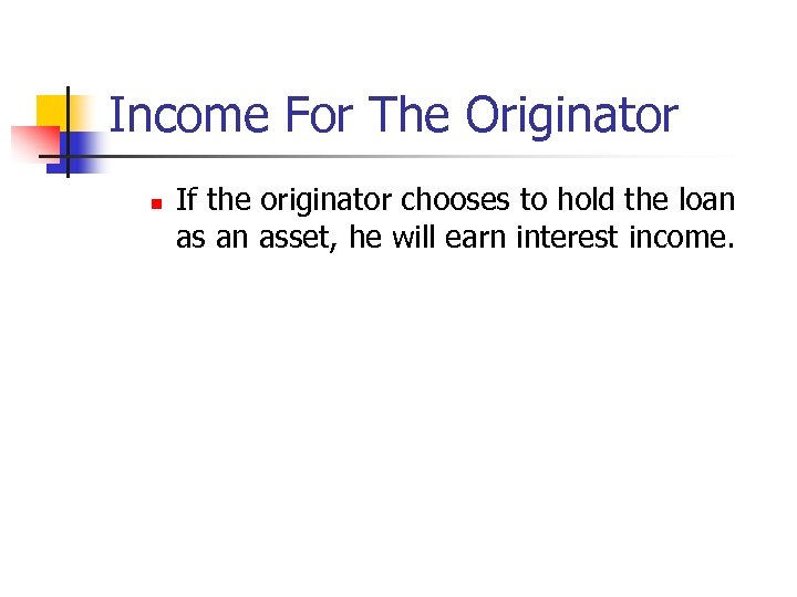 Income For The Originator n If the originator chooses to hold the loan asset, he will earn interest income.