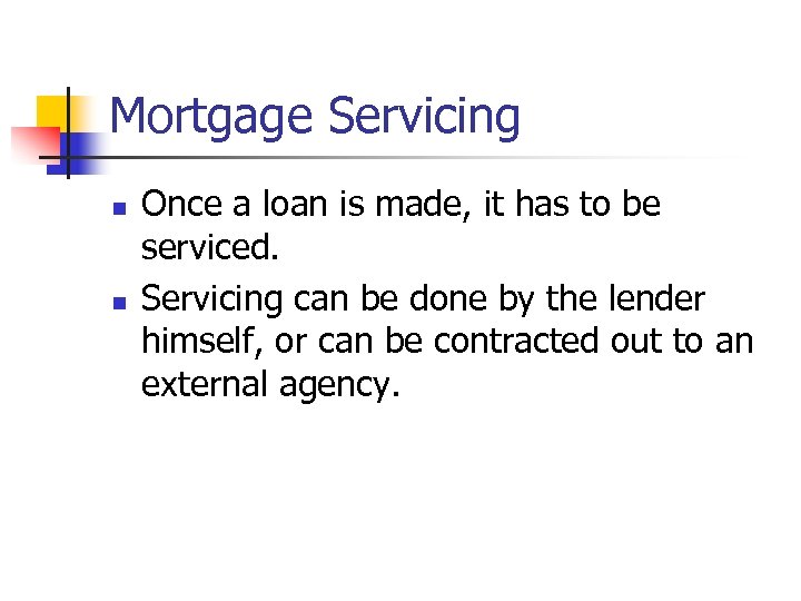 Mortgage Servicing n n Once a loan is made, it has to be serviced. Servicing can be done by the lender himself, or can be contracted out to an external agency.