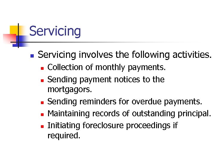 Servicing n Servicing involves the following activities. n n n Collection of monthly payments. Sending payment notices to the mortgagors. Sending reminders for overdue payments. Maintaining records of outstanding principal. Initiating foreclosure proceedings if required.