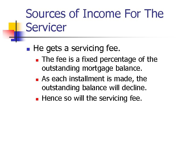 Sources of Income For The Servicer n He gets a servicing fee. n n n The fee is a fixed percentage of the outstanding mortgage balance. As each installment is made, the outstanding balance will decline. Hence so will the servicing fee.