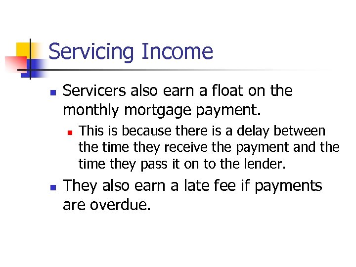 Servicing Income n Servicers also earn a float on the monthly mortgage payment. n n This is because there is a delay between the time they receive the payment and the time they pass it on to the lender. They also earn a late fee if payments are overdue.