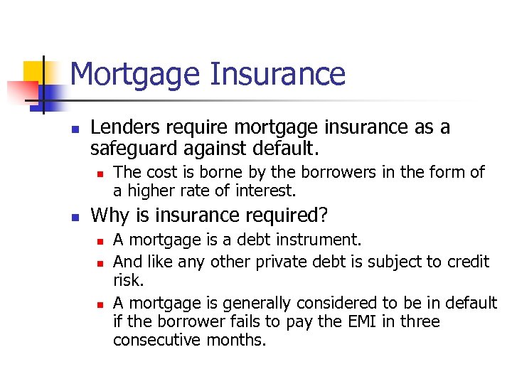 Mortgage Insurance n Lenders require mortgage insurance as a safeguard against default. n n The cost is borne by the borrowers in the form of a higher rate of interest. Why is insurance required? n n n A mortgage is a debt instrument. And like any other private debt is subject to credit risk. A mortgage is generally considered to be in default if the borrower fails to pay the EMI in three consecutive months.