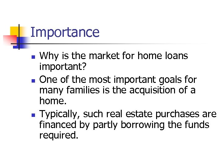 Importance n n n Why is the market for home loans important? One of the most important goals for many families is the acquisition of a home. Typically, such real estate purchases are financed by partly borrowing the funds required.