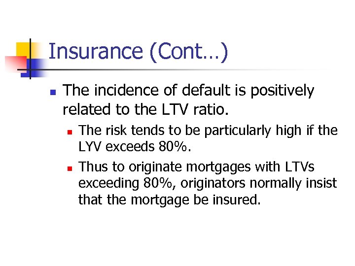 Insurance (Cont…) n The incidence of default is positively related to the LTV ratio. n n The risk tends to be particularly high if the LYV exceeds 80%. Thus to originate mortgages with LTVs exceeding 80%, originators normally insist that the mortgage be insured.