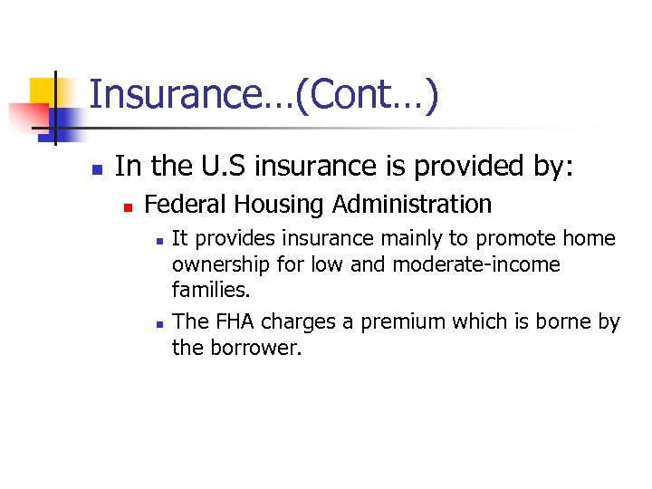 Insurance…(Cont…) n In the U. S insurance is provided by: n Federal Housing Administration n n It provides insurance mainly to promote home ownership for low and moderate-income families. The FHA charges a premium which is borne by the borrower.