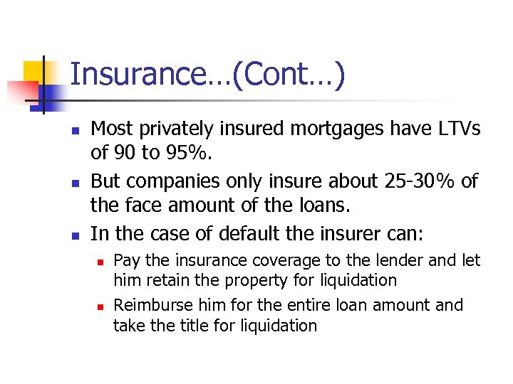 Insurance…(Cont…) n n n Most privately insured mortgages have LTVs of 90 to 95%. But companies only insure about 25 -30% of the face amount of the loans. In the case of default the insurer can: n n Pay the insurance coverage to the lender and let him retain the property for liquidation Reimburse him for the entire loan amount and take the title for liquidation