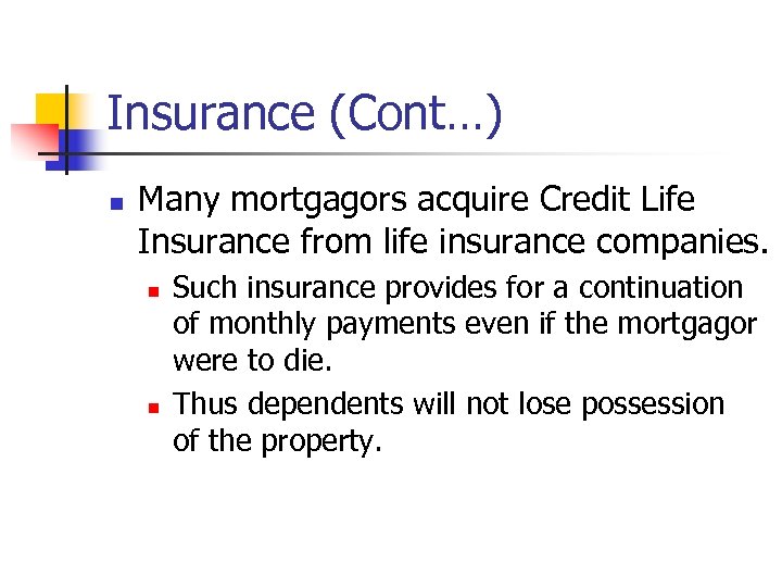 Insurance (Cont…) n Many mortgagors acquire Credit Life Insurance from life insurance companies. n n Such insurance provides for a continuation of monthly payments even if the mortgagor were to die. Thus dependents will not lose possession of the property.