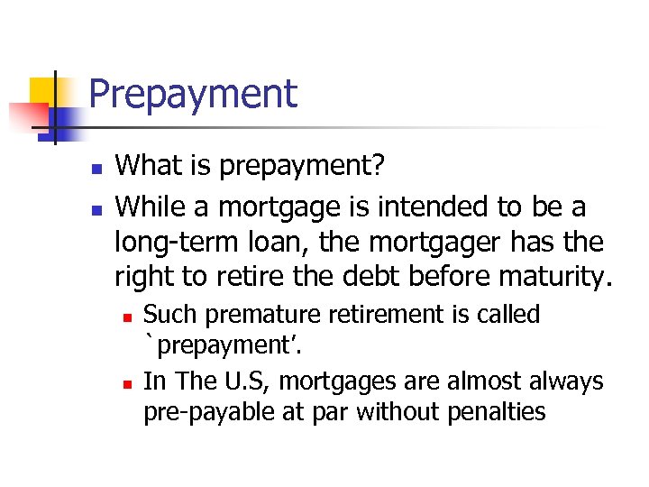 Prepayment n n What is prepayment? While a mortgage is intended to be a long-term loan, the mortgager has the right to retire the debt before maturity. n n Such premature retirement is called `prepayment’. In The U. S, mortgages are almost always pre-payable at par without penalties