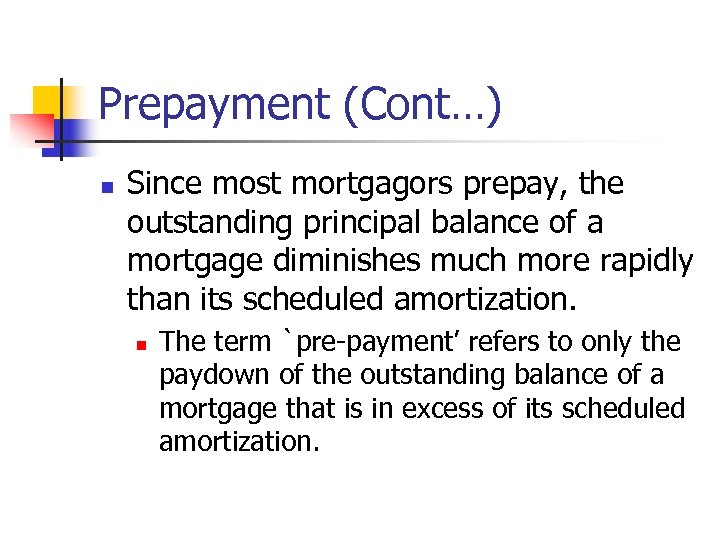 Prepayment (Cont…) n Since most mortgagors prepay, the outstanding principal balance of a mortgage diminishes much more rapidly than its scheduled amortization. n The term `pre-payment’ refers to only the paydown of the outstanding balance of a mortgage that is in excess of its scheduled amortization.