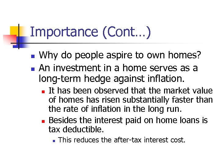 Importance (Cont…) n n Why do people aspire to own homes? An investment in a home serves as a long-term hedge against inflation. n n It has been observed that the market value of homes has risen substantially faster than the rate of inflation in the long run. Besides the interest paid on home loans is tax deductible. n This reduces the after-tax interest cost.