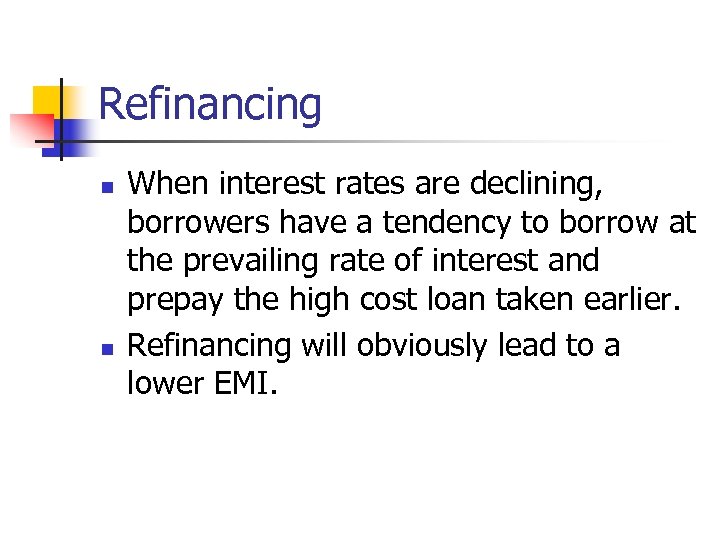 Refinancing n n When interest rates are declining, borrowers have a tendency to borrow at the prevailing rate of interest and prepay the high cost loan taken earlier. Refinancing will obviously lead to a lower EMI.