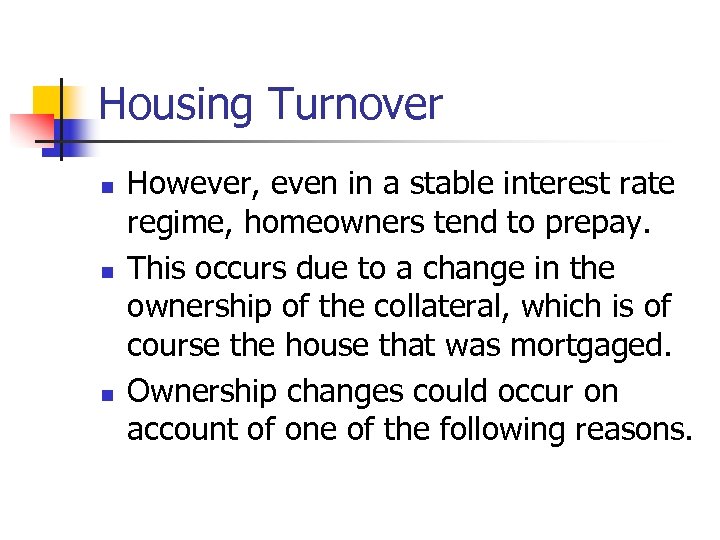 Housing Turnover n n n However, even in a stable interest rate regime, homeowners tend to prepay. This occurs due to a change in the ownership of the collateral, which is of course the house that was mortgaged. Ownership changes could occur on account of one of the following reasons.