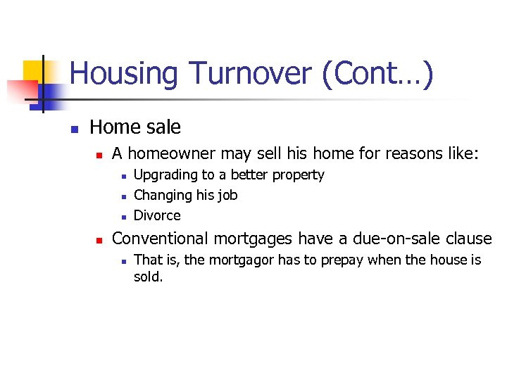 Housing Turnover (Cont…) n Home sale n A homeowner may sell his home for reasons like: n n Upgrading to a better property Changing his job Divorce Conventional mortgages have a due-on-sale clause n That is, the mortgagor has to prepay when the house is sold.