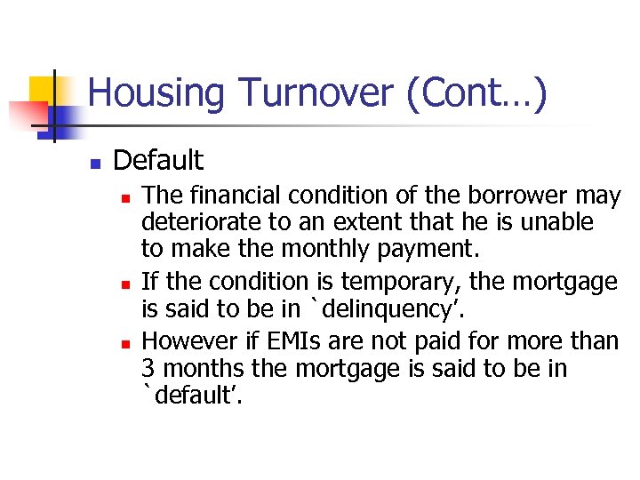 Housing Turnover (Cont…) n Default n n n The financial condition of the borrower may deteriorate to an extent that he is unable to make the monthly payment. If the condition is temporary, the mortgage is said to be in `delinquency’. However if EMIs are not paid for more than 3 months the mortgage is said to be in `default’.