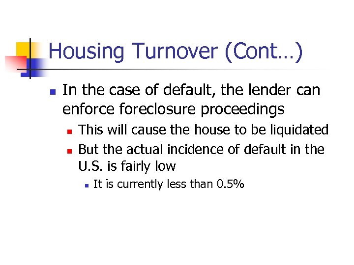 Housing Turnover (Cont…) n In the case of default, the lender can enforce foreclosure proceedings n n This will cause the house to be liquidated But the actual incidence of default in the U. S. is fairly low n It is currently less than 0. 5%