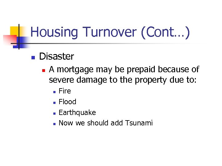 Housing Turnover (Cont…) n Disaster n A mortgage may be prepaid because of severe damage to the property due to: n n Fire Flood Earthquake Now we should add Tsunami