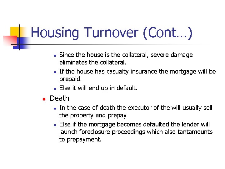 Housing Turnover (Cont…) n n Since the house is the collateral, severe damage eliminates the collateral. If the house has casualty insurance the mortgage will be prepaid. Else it will end up in default. Death n n In the case of death the executor of the will usually sell the property and prepay Else if the mortgage becomes defaulted the lender will launch foreclosure proceedings which also tantamounts to prepayment.