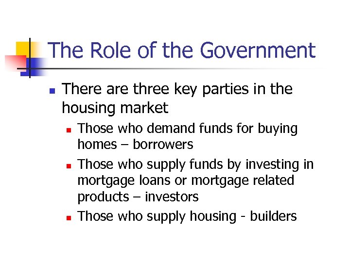 The Role of the Government n There are three key parties in the housing market n n n Those who demand funds for buying homes – borrowers Those who supply funds by investing in mortgage loans or mortgage related products – investors Those who supply housing - builders
