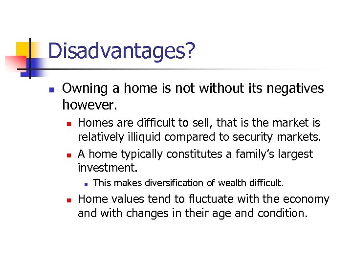 Disadvantages? n Owning a home is not without its negatives however. n n Homes are difficult to sell, that is the market is relatively illiquid compared to security markets. A home typically constitutes a family’s largest investment. n n This makes diversification of wealth difficult. Home values tend to fluctuate with the economy and with changes in their age and condition.