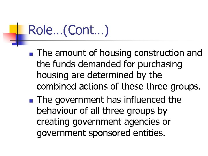 Role…(Cont…) n n The amount of housing construction and the funds demanded for purchasing housing are determined by the combined actions of these three groups. The government has influenced the behaviour of all three groups by creating government agencies or government sponsored entities.