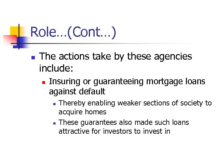 Role…(Cont…) n The actions take by these agencies include: n Insuring or guaranteeing mortgage loans against default n n Thereby enabling weaker sections of society to acquire homes These guarantees also made such loans attractive for investors to invest in