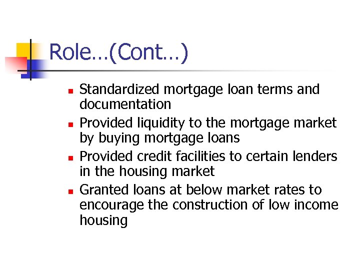 Role…(Cont…) n n Standardized mortgage loan terms and documentation Provided liquidity to the mortgage market by buying mortgage loans Provided credit facilities to certain lenders in the housing market Granted loans at below market rates to encourage the construction of low income housing