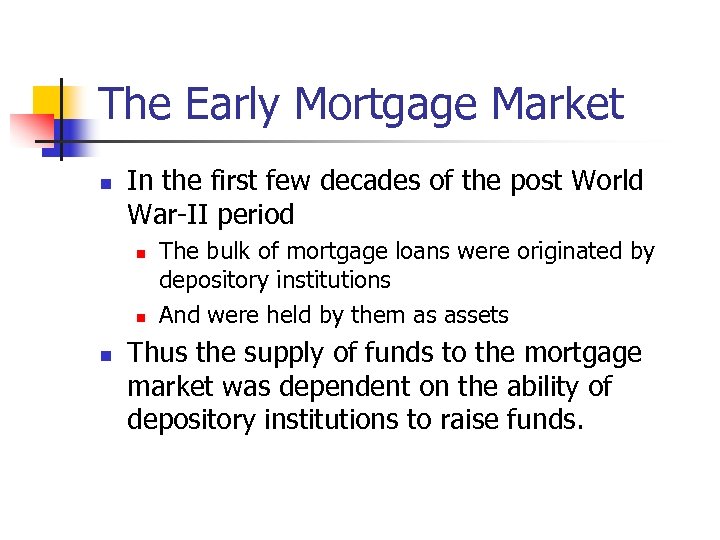 The Early Mortgage Market n In the first few decades of the post World War-II period n n n The bulk of mortgage loans were originated by depository institutions And were held by them as assets Thus the supply of funds to the mortgage market was dependent on the ability of depository institutions to raise funds.