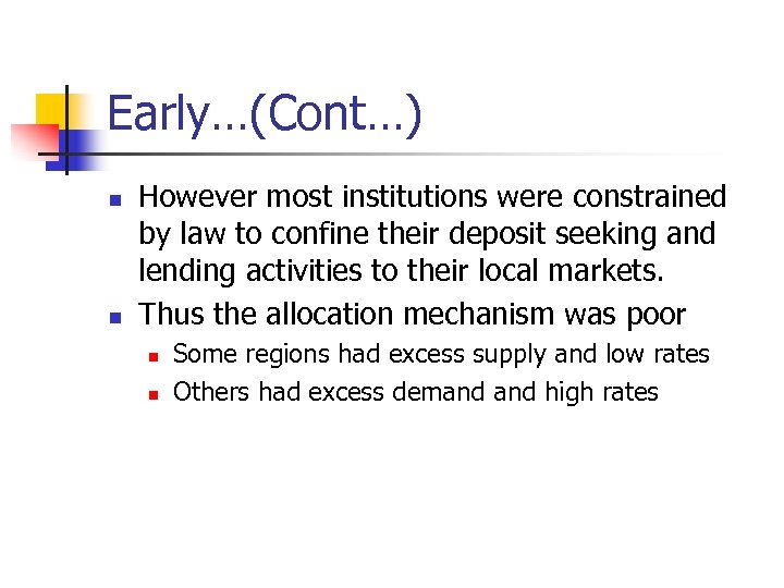 Early…(Cont…) n n However most institutions were constrained by law to confine their deposit seeking and lending activities to their local markets. Thus the allocation mechanism was poor n n Some regions had excess supply and low rates Others had excess demand high rates