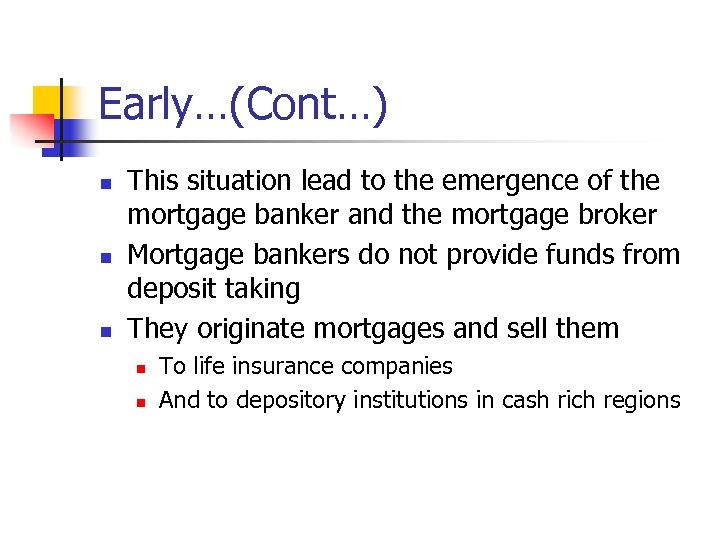 Early…(Cont…) n n n This situation lead to the emergence of the mortgage banker and the mortgage broker Mortgage bankers do not provide funds from deposit taking They originate mortgages and sell them n n To life insurance companies And to depository institutions in cash rich regions