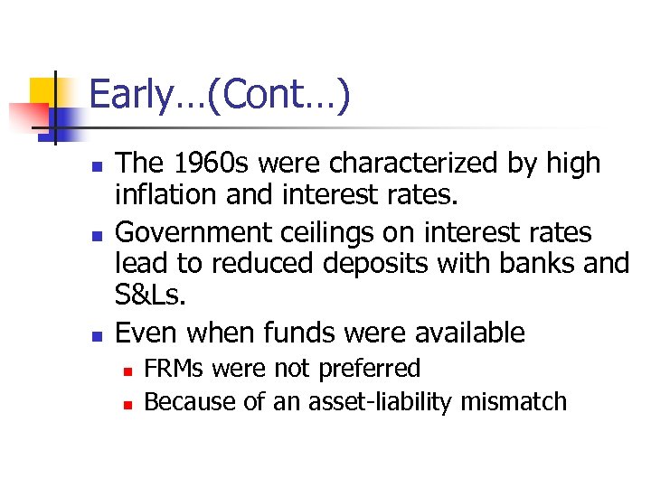 Early…(Cont…) n n n The 1960 s were characterized by high inflation and interest rates. Government ceilings on interest rates lead to reduced deposits with banks and S&Ls. Even when funds were available n n FRMs were not preferred Because of an asset-liability mismatch