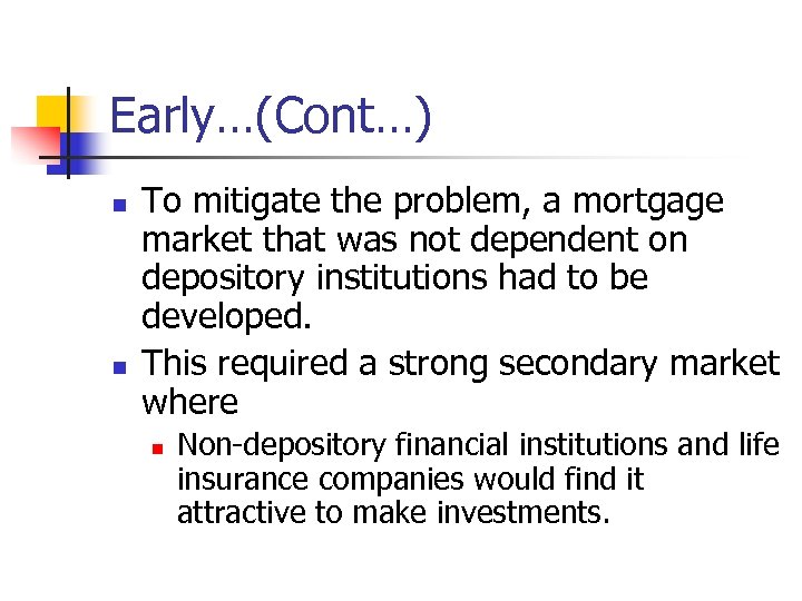Early…(Cont…) n n To mitigate the problem, a mortgage market that was not dependent on depository institutions had to be developed. This required a strong secondary market where n Non-depository financial institutions and life insurance companies would find it attractive to make investments.