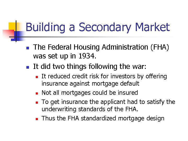 Building a Secondary Market n n The Federal Housing Administration (FHA) was set up in 1934. It did two things following the war: n n It reduced credit risk for investors by offering insurance against mortgage default Not all mortgages could be insured To get insurance the applicant had to satisfy the underwriting standards of the FHA. Thus the FHA standardized mortgage design