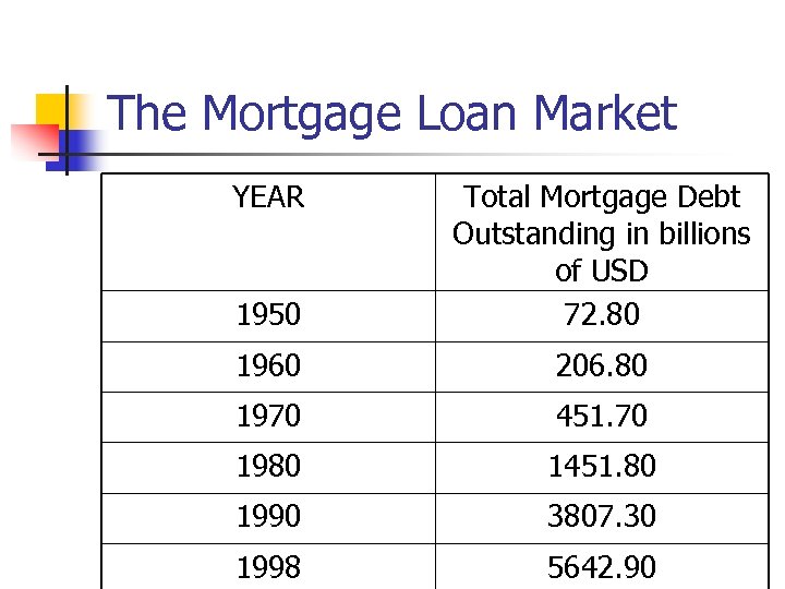 The Mortgage Loan Market YEAR 1950 Total Mortgage Debt Outstanding in billions of USD 72. 80 1960 206. 80 1970 451. 70 1980 1451. 80 1990 3807. 30 1998 5642. 90