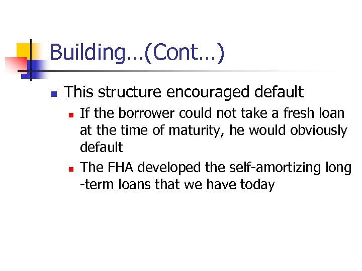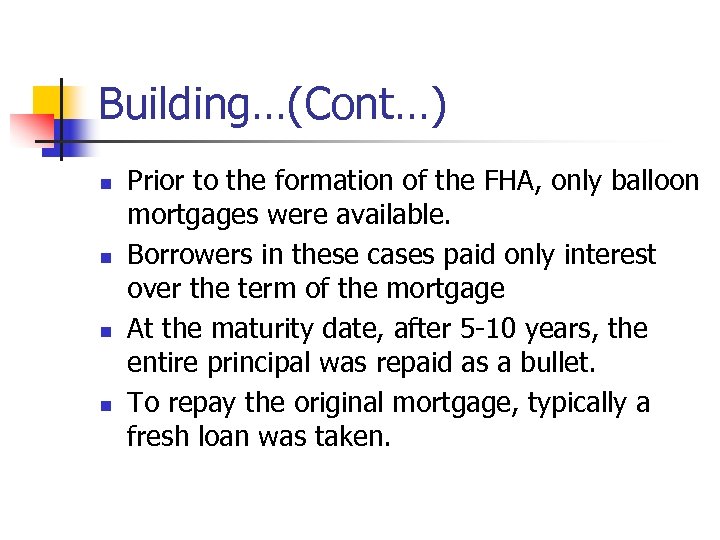 Building…(Cont…) n n Prior to the formation of the FHA, only balloon mortgages were available. Borrowers in these cases paid only interest over the term of the mortgage At the maturity date, after 5 -10 years, the entire principal was repaid as a bullet. To repay the original mortgage, typically a fresh loan was taken.
