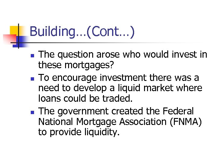 Building…(Cont…) n n n The question arose who would invest in these mortgages? To encourage investment there was a need to develop a liquid market where loans could be traded. The government created the Federal National Mortgage Association (FNMA) to provide liquidity.