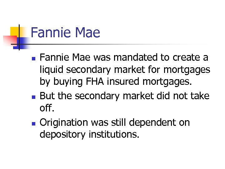 Fannie Mae n n n Fannie Mae was mandated to create a liquid secondary market for mortgages by buying FHA insured mortgages. But the secondary market did not take off. Origination was still dependent on depository institutions.