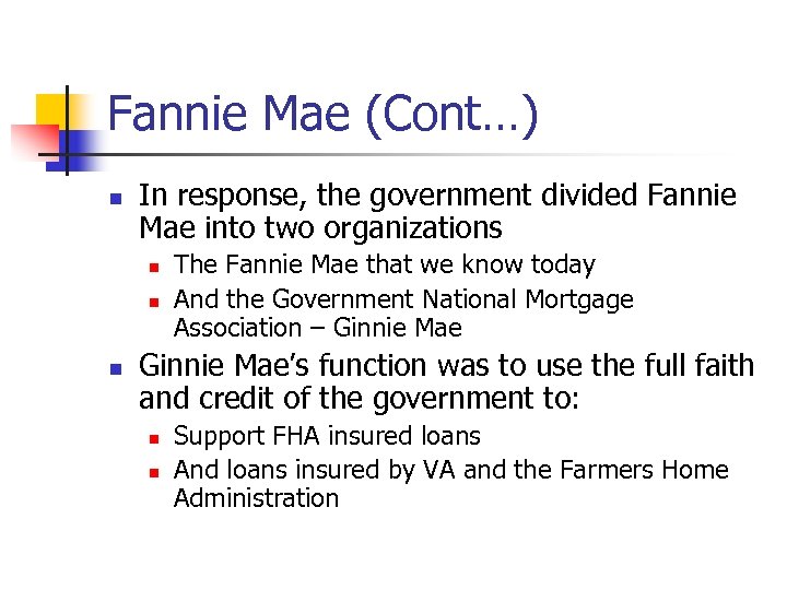Fannie Mae (Cont…) n In response, the government divided Fannie Mae into two organizations n n n The Fannie Mae that we know today And the Government National Mortgage Association – Ginnie Mae’s function was to use the full faith and credit of the government to: n n Support FHA insured loans And loans insured by VA and the Farmers Home Administration