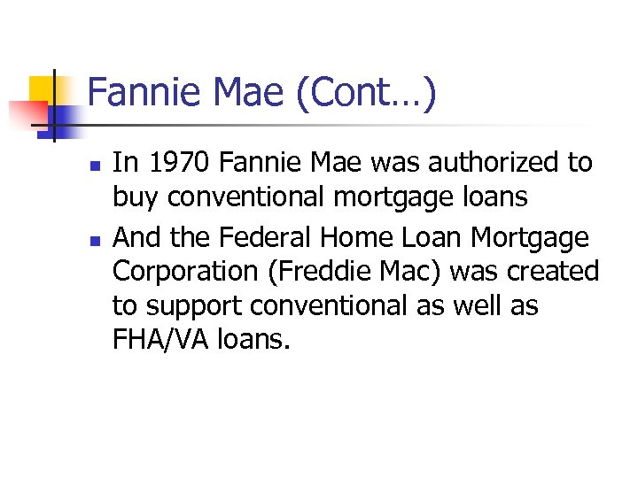 Fannie Mae (Cont…) n n In 1970 Fannie Mae was authorized to buy conventional mortgage loans And the Federal Home Loan Mortgage Corporation (Freddie Mac) was created to support conventional as well as FHA/VA loans.